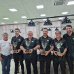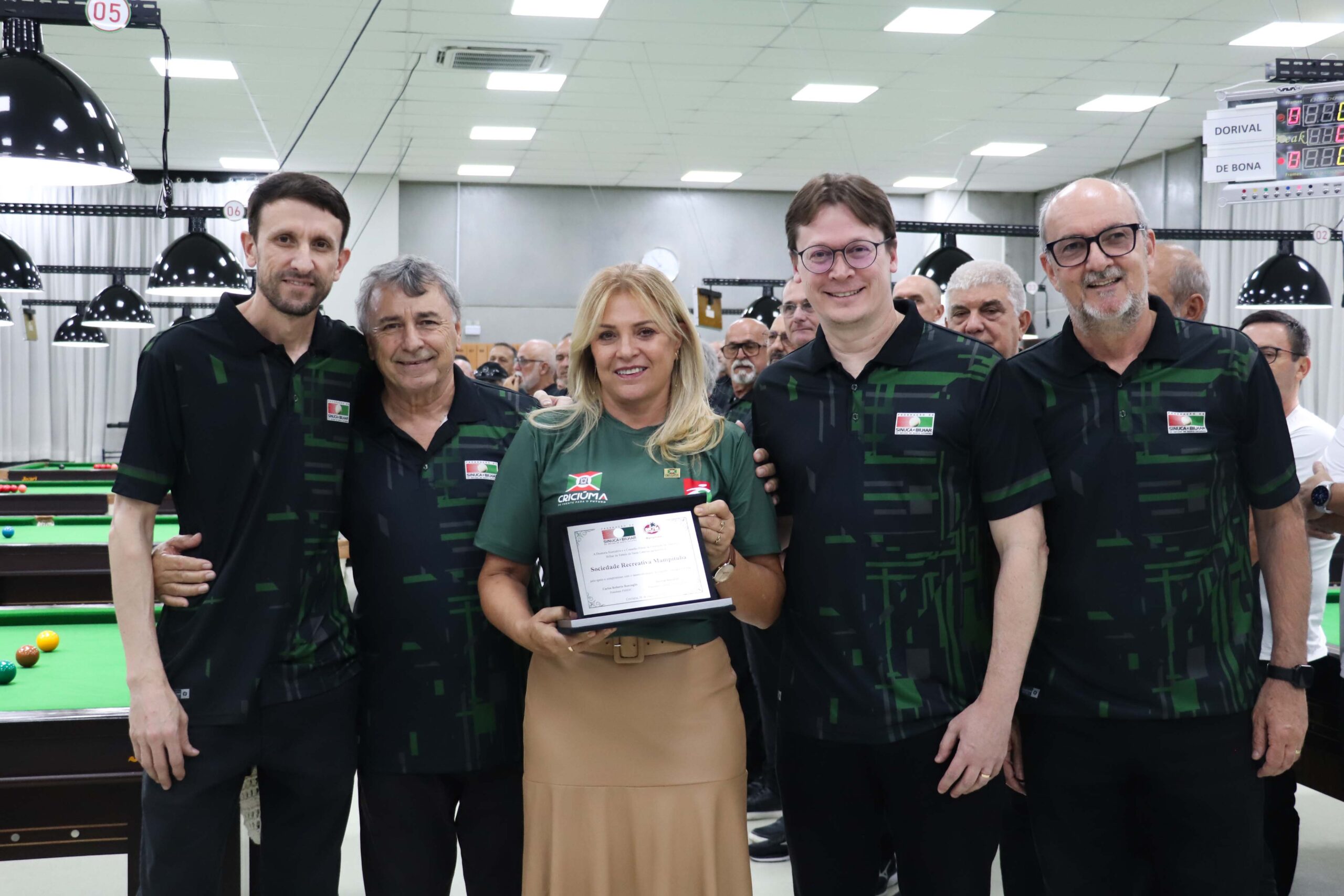 O presidente da federação, Carlos Roberto Roncaglio, entregou uma placa de reconhecimento à vice-presidente Administrativa do Mampituba, Robinalva Ferreira, ao diretor de Sinuca, Valmir Fernandes (Bedeu), e ao coordenador da modalidade, Claudiomar Frezza (Mafré).