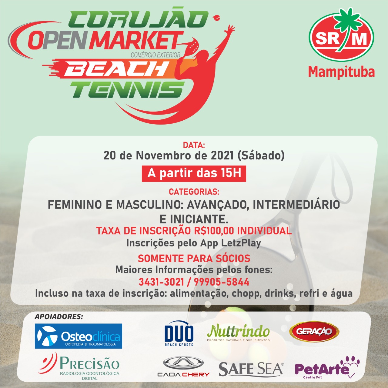 Já estão abertas as inscrições para o Corujão Open Market de Beach Tennis da Sociedade Recreativa Mampituba. A competição ocorrerá no dia 20 de novembro a partir das 15h nas quadras da modalidade no clube.