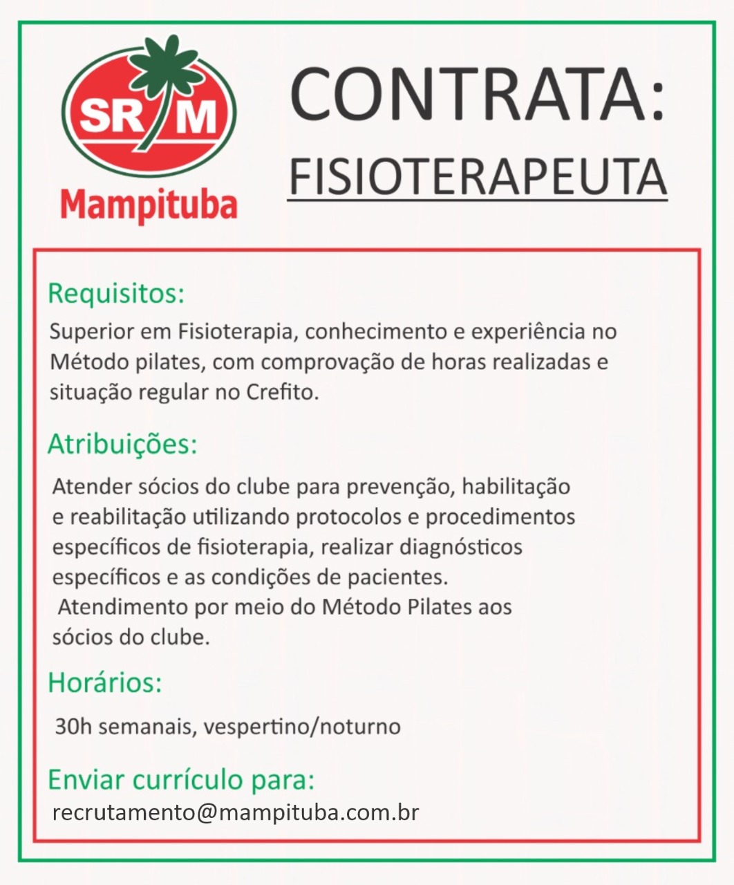 A Sociedade Recreativa Mampituba está contratando fisioterapeuta. Os requisitos principais para o cargo são formação em Fisioterapia, conhecimento e experiência no Método Pilates, com comprovação de horas realizadas e situação regular no Crefito. A carga horária é de 30 horas semanais, nos períodos vespertino/noturno. Remuneração a combinar. Interessados devem encaminhar currículo para o e-mail: [email protected].