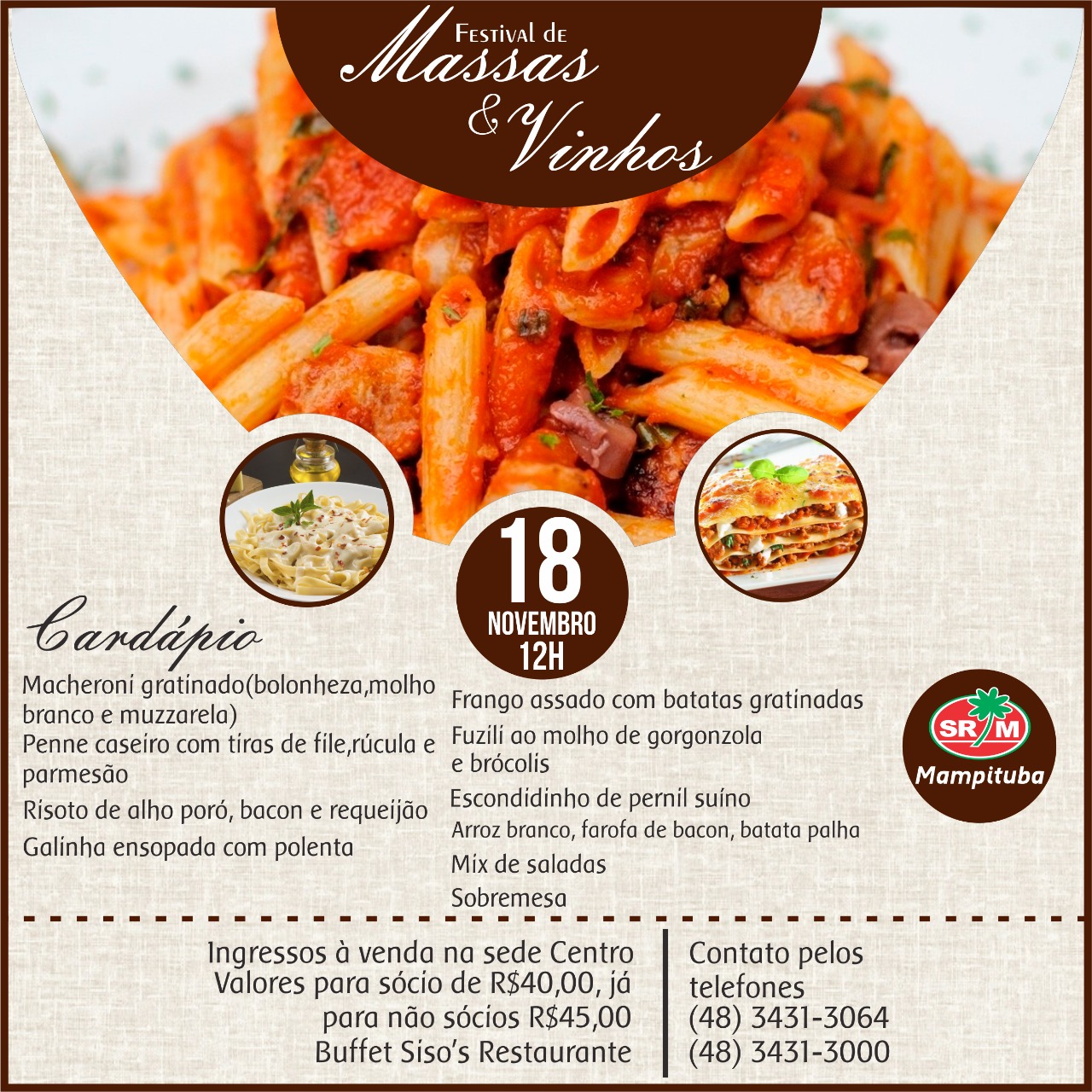 O tradicional almoço da Sociedade Recreativa Mampituba será realizado no dia 18 deste mês. O Festival de Massas e Vinhos conta com mais de 10 pratos no cardápio e contará com a qualidade do Buffet Siso’s Restaurantes. O evento acontecerá às 12 horas, no Salão Abílio Paulo, Salão Principal. O cardápio inclui macheroni gratinado; penne […]