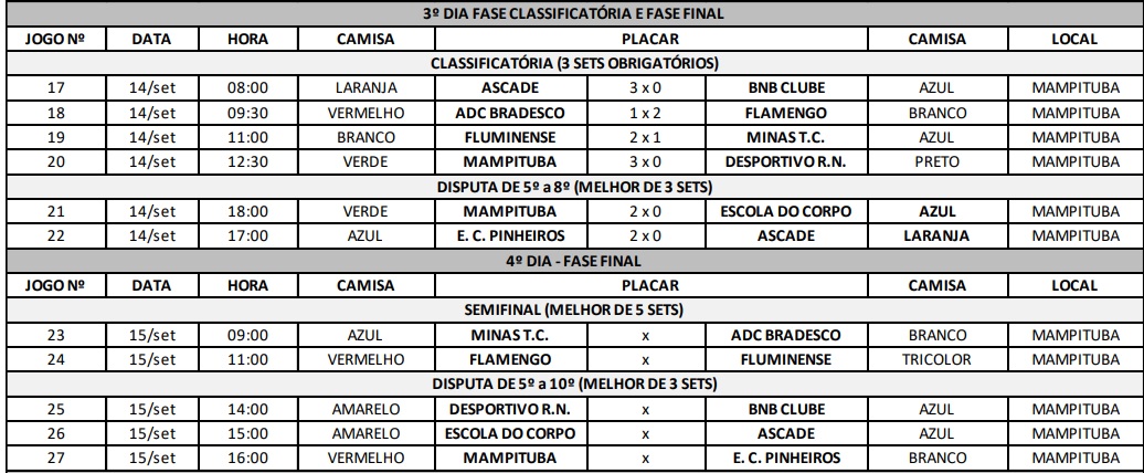 Nesta quarta-feira, dia 14, se encerrou o terceiro dia do Campeonato Brasileiro Interclubes de Vôlei Feminino Sub-21.A competição é aberta ao público. Venha prestigiar!!! Confira os resultados: